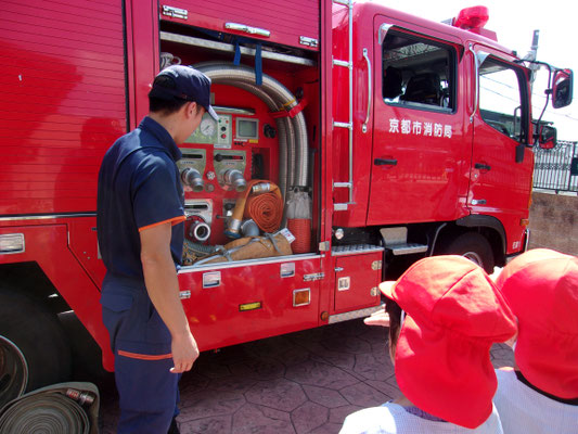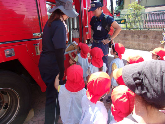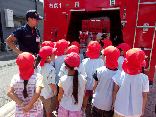 トピックス · 2025/08/18 消防署の施設点検 消防署の方々が、施設点検の為に来られ、その時に消防車の見学をさせてもらいました。消防士さんの説明に真剣に見つめる子どもたち。「これ何?」と興味津々!で質問していました。消防士さんは丁寧にやさしく答えてくれました。真っ赤な消防車見て、感動した様子の子どもたちでした。 tagPlaceholderカテゴリ: